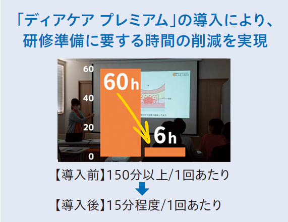 事業所内では月2回研修を行い、職員が研鑽を積んでいます。以前から動画研修を取り入れており、テーマ設定から動画制作まで自社で実施していましたが、「ディアケア プレミアム」の導入により、研修準備に要する時間の削減を実現しました。