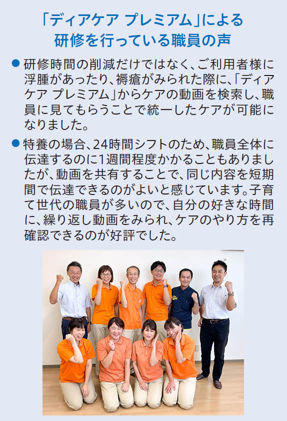 「ディアケア プレミアム」のようなWeb学習を取り入れることで、これまで課題となっていた研修受講のための移動の負担や時間の削減、また前述のように質の高い技術の習得にもつながったと感じています。技術力の向上がご利用者様の状態アップにつながったことで職員自身が成長を実感し、人材の定着と地域福祉の活性化につながり、結果として、ご利用者様の満足度も上がるといった好循環を生み出しています。