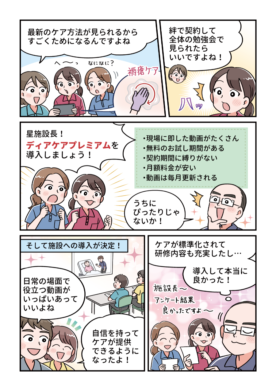 瀧田主任:ディアケアプレミアムの動画を全体で視聴する時間を設けているんですが、個人的に勉強のために見ている職員もいます。先日は、介護のメンバーから「ディアケアで見たんですが」と褥瘡のポジショニングについての提案があったんです。とても嬉しかったですね。