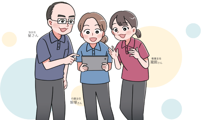 星 施設長:こうして働きやすい職場環境が整いはじめたことで、職員の数も増加しています。以前は看護師が3〜4人でしたが、今では8人にまで増えました。増員によって、以前は受け入れることができなかった経管栄養の方も当施設に入居していただけるようになったんです。