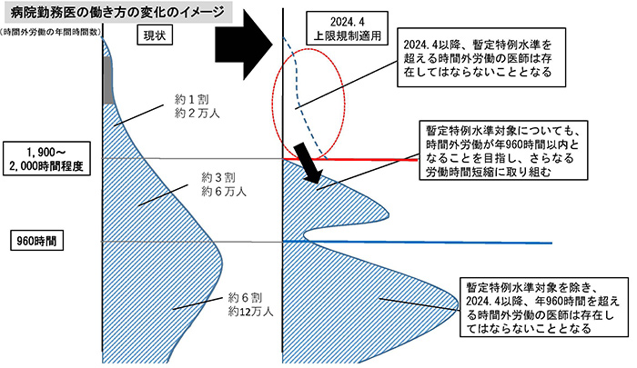 これは、2024年4月から一般の勤務医の時間外労働の上限を「年間960時間以内、月100時間未満」(休日労働込み)とするとしたうえで、地域医療の確保という観点から、この上限をやむを得ず超える場合には、対象医療機関を限定したうえで、時間外労働の上限を「年間1,900~2,000時間程度以内」(休日労働込み)とする特例の水準(地域医療確保暫定特例水準)を設けたものだ。ただし、これは、医師の偏在を解消する目標年である2035年度末までの特例であるとされている。