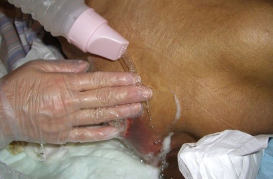 褥瘡周囲の皮膚は、皮膚表面の汗や皮脂に加え、創からの滲出液や細菌、排泄物などにより汚染されています。褥瘡周囲の皮膚を洗浄し汚れを除去することは、創感染のリスクを減らすとともに表皮化を進めることができるので、褥瘡の治癒促進のためには重要です。